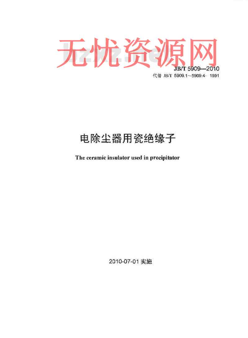 本标准规定了电除尘器用瓷绝缘子的术语和定义、型号编制办法与型式分类、技术要求、试验方法、检验规则、包装、标志和运输等要求。本标准除了适用于烟气温度在400℃以下的电除尘器中维持高压电场的各种瓷绝缘子,还适用于工况条件类似的电除雾器和电捕器中工作的瓷绝缘子。本标准不适用于烟气中含有大量煤焦油以及可使瓷表面产生凝露或遭受雨水浸湿的工作环境下使用的瓷绝缘子。 JB/T 5909-2010 电除尘器用瓷绝缘子 JB/T5909-2010