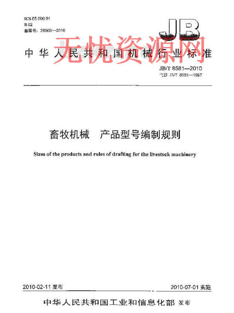 本标准规定了畜牧机械产品型号的编制方法和原则。本标准适用于各类畜牧机械产品型号的编制和管理。 JB/T 8581-2010 畜牧机械 产品型号编制规则 JB/T8581-2010