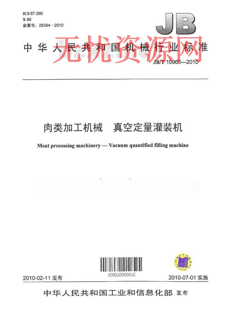 本标准规定了肉类加工机械真空定量灌装机的产品分类、技术要求、试验方法、检验规则、标志、包装、运输和贮存。本标准适用于肠衣包装的真空定量灌装机。 JB/T 10965-2010 肉类加工机械 真空定量灌装机 JB/T10965-2010